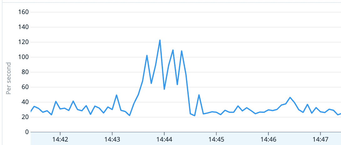 The number of function calls elided by request collapsing varies a lot over time. E.g. the graph below shows request collapsed jumping from 30 per second to 120 per second for a short window.