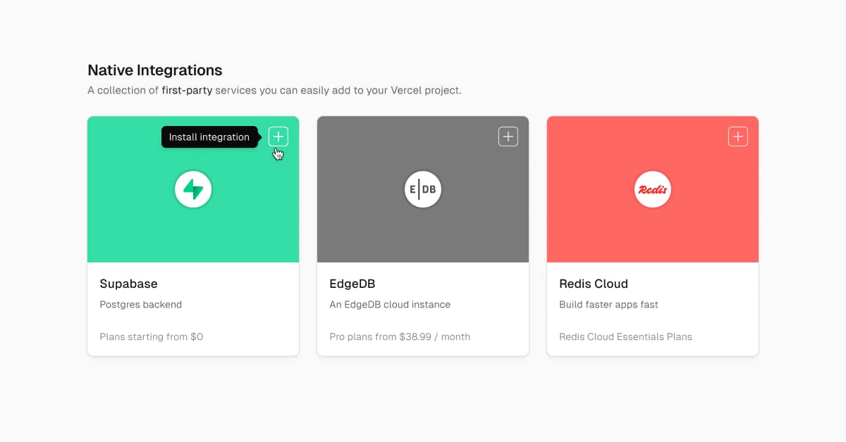 The Vercel Marketplace allows you to integrate services directly into your Vercel projects, without leaving your Vercel dashboard, giving you: