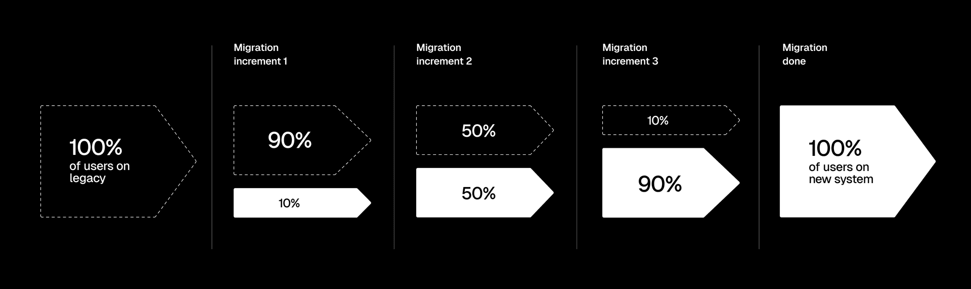 In this strategy, subsets of system functionality are switched to the new system. Think of this as migrating one feature at a time where both systems are operating in parallel and functionality is routed to the new or legacy system based on whether the respective feature has been migrated or not.