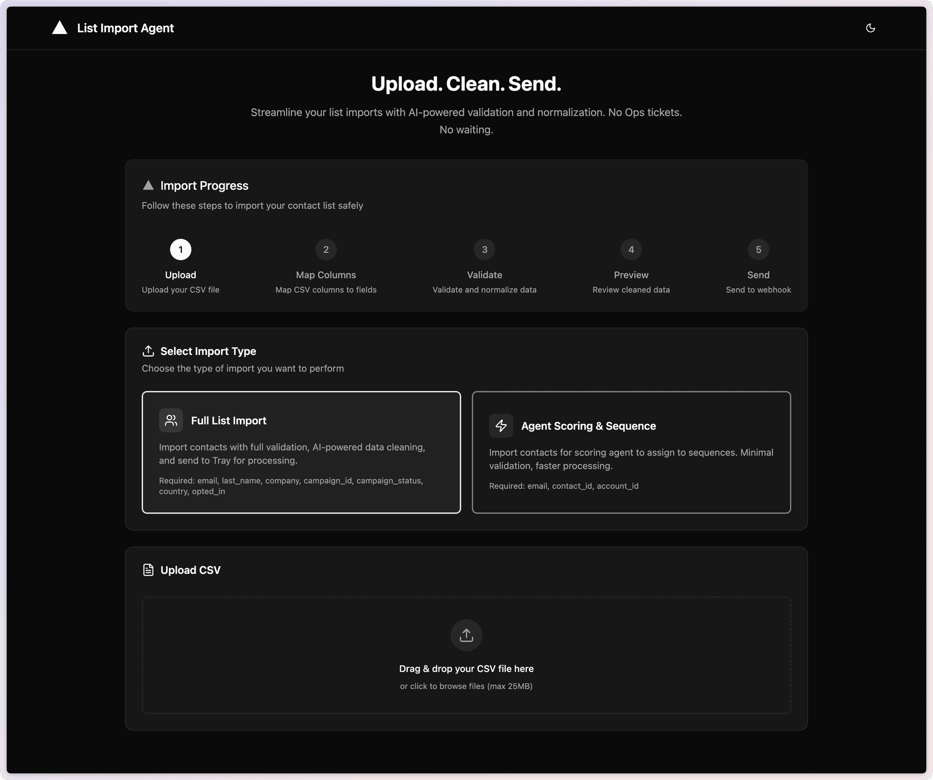 Marketing lead list import: Importing leads from events, campaigns, and other systems was traditionally a manual, spreadsheet-based process that required post-import human cleanup every time. We built a tool that uses AI to clean emails against our own data, then scores each lead so that they are segmented correctly on the first import. Now our marketing can import lists from any source quickly and safely.