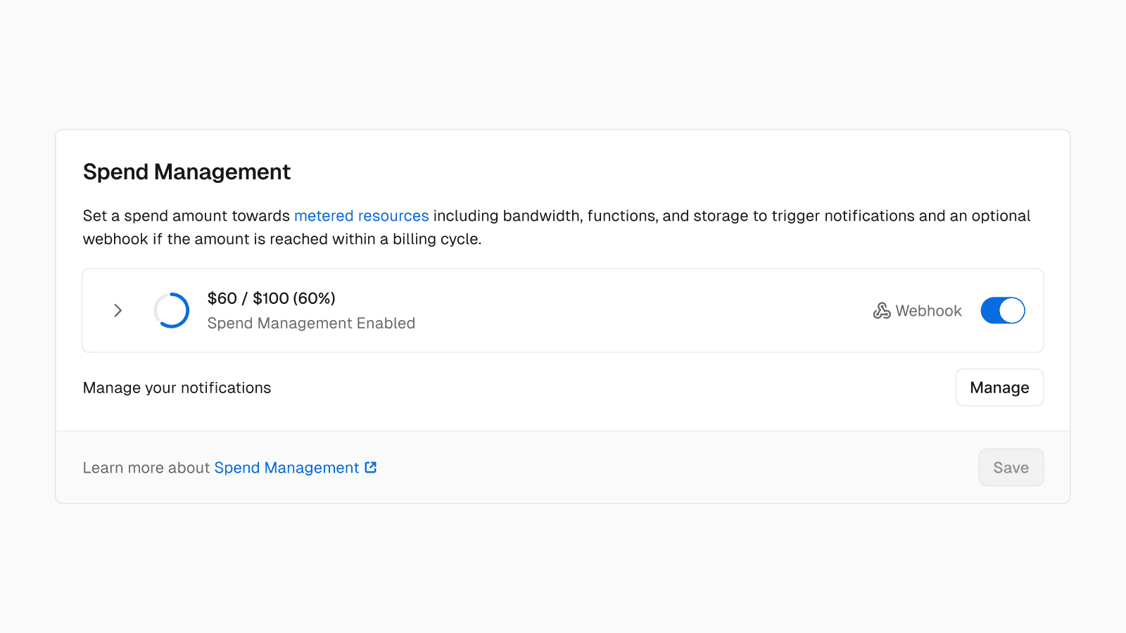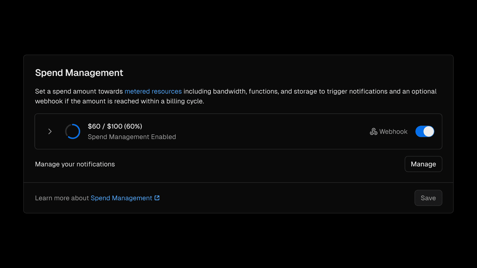 You can control the maximum duration functions run, monitor usage in real time, block traffic patterns, and set both soft and hard limits based on your spend. These alerts can be sent in the Vercel dashboard, through email, or even SMS. This visibility and control allows you to optimize your usage and keep costs under control.