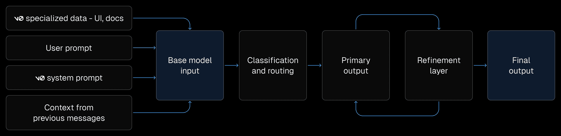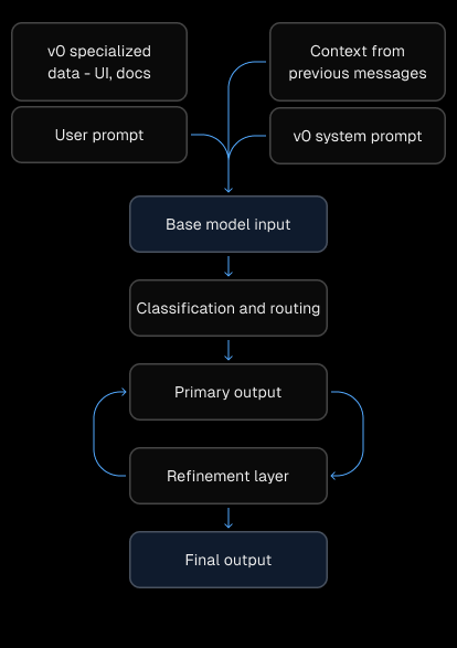 While this may sound complex, it enables v0 to achieve significantly higher quality when generating code. Further, as base models improve, we can quickly upgrade to the latest frontier model while keeping the rest of the architecture stable.