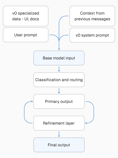 Because of v0’s composite architecture, base models can be updated or replaced as new models become available without needing to rebuild the entire model pipeline. For example, v0-1.0-md currently uses Anthropic's Sonnet 3.7 while v0-1.5-md uses Sonnet 4. The composite model architecture allowed us to upgrade the base model while keeping the rest of the stack stable.
