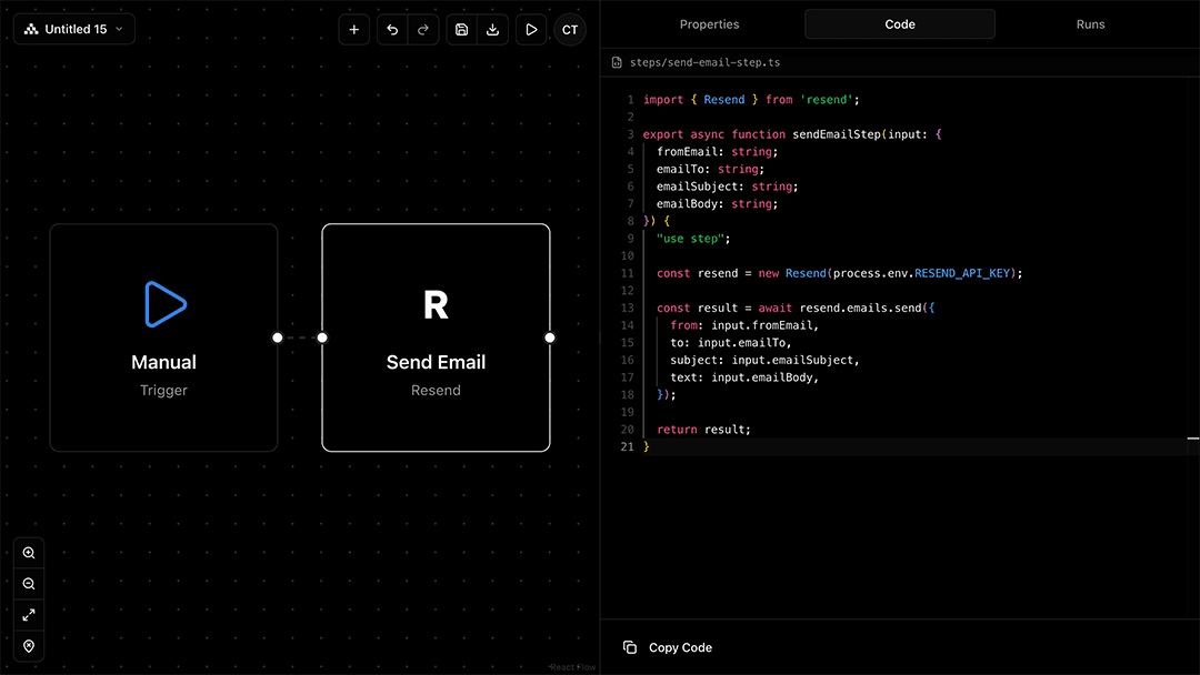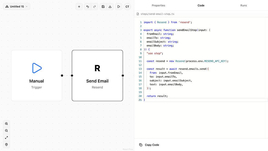 Every visual workflow compiles into executable TypeScript via the Workflow Development Kit (WDK). The "use workflow" and "use step" directives transform your functions into a runtime execution graph that handles state management, error handling, and step coordination.