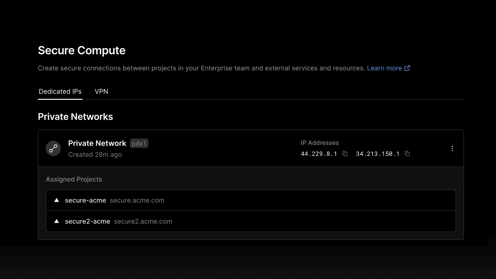 Enterprise customers can now opt-into deploying to a isolated private network with dedicated IP addresses. This includes all production and preview traffic. Additionally, builds can be placed in specific regions and isolated from other customers.