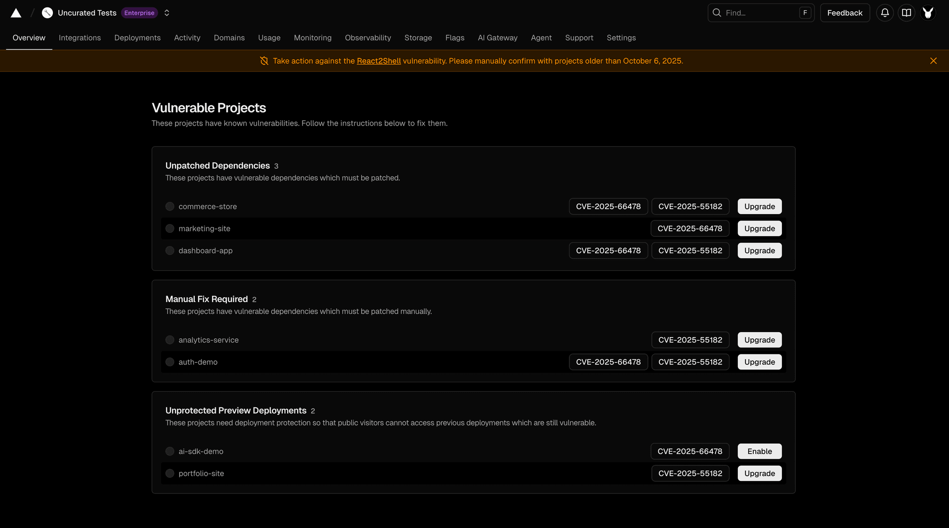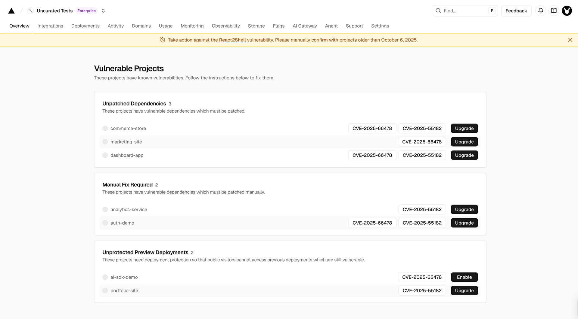 • Project grouping based on required actions - Current categories include unpatched dependencies, manual fix required, unprotected preview deployments. Additional groups will appear over time as new protections and checks are added.