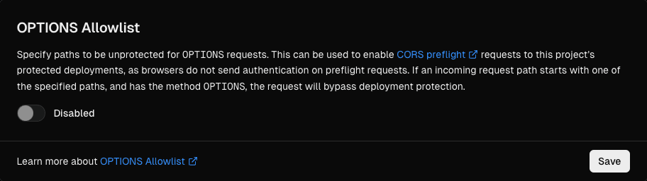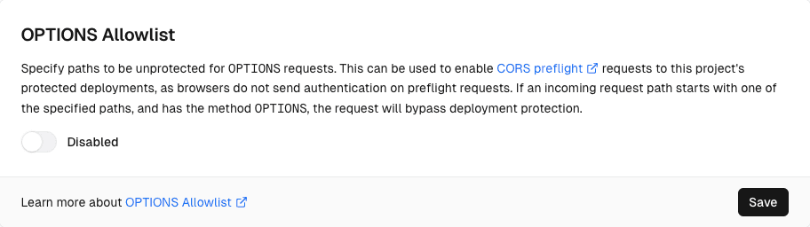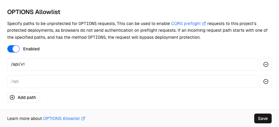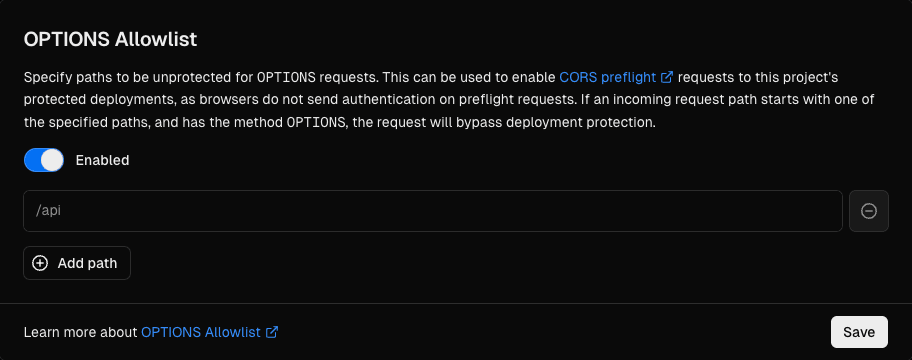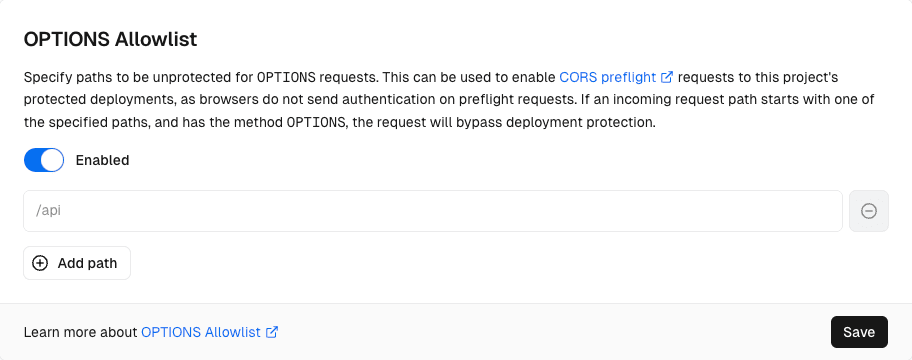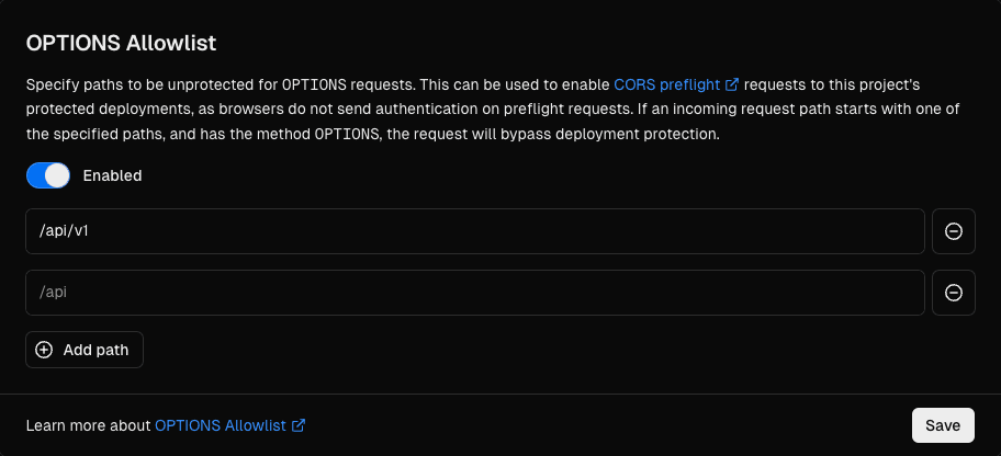 When you add a path to OPTIONS Allowlist, any incoming request with the method that starts with the path will no longer be covered by Deployment Protection. When you remove a path from OPTIONS Allowlist, the path becomes protected again with the project's Deployment Protection settings.