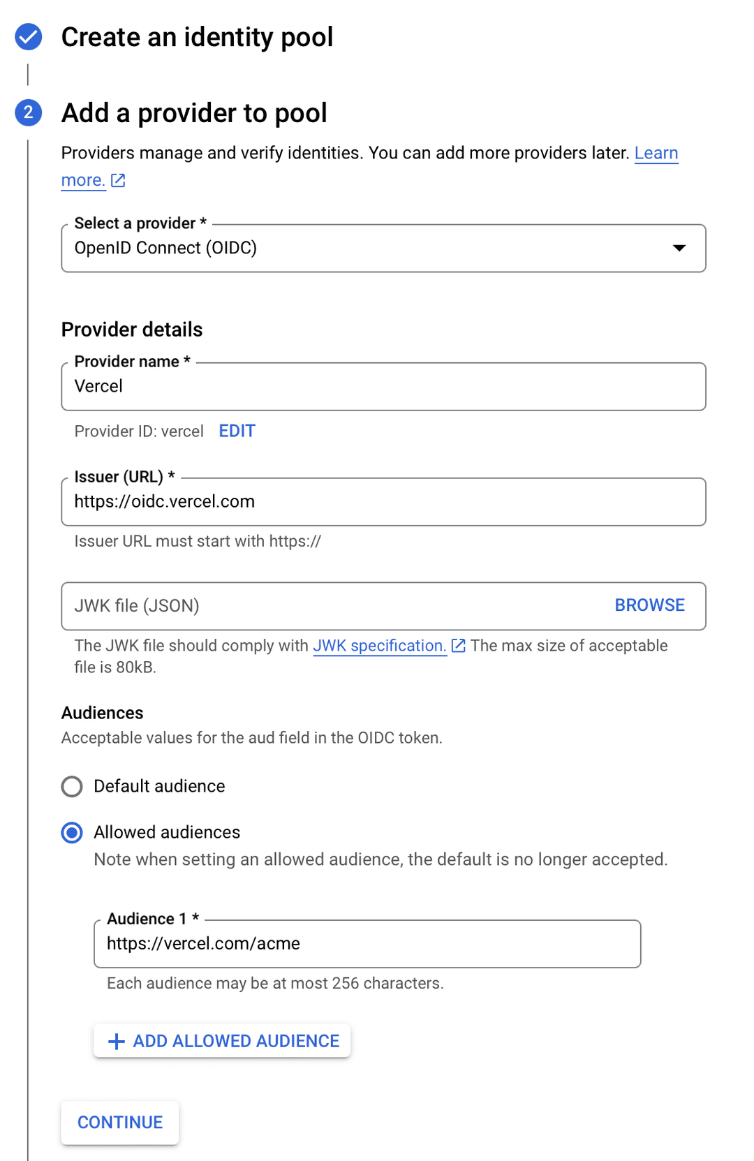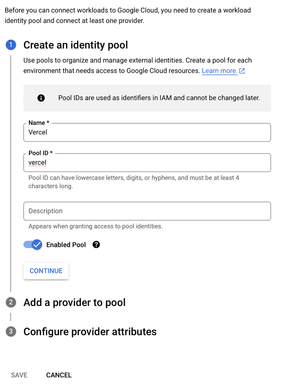 2. Enter an ID for the pool, e.g. and click Continue