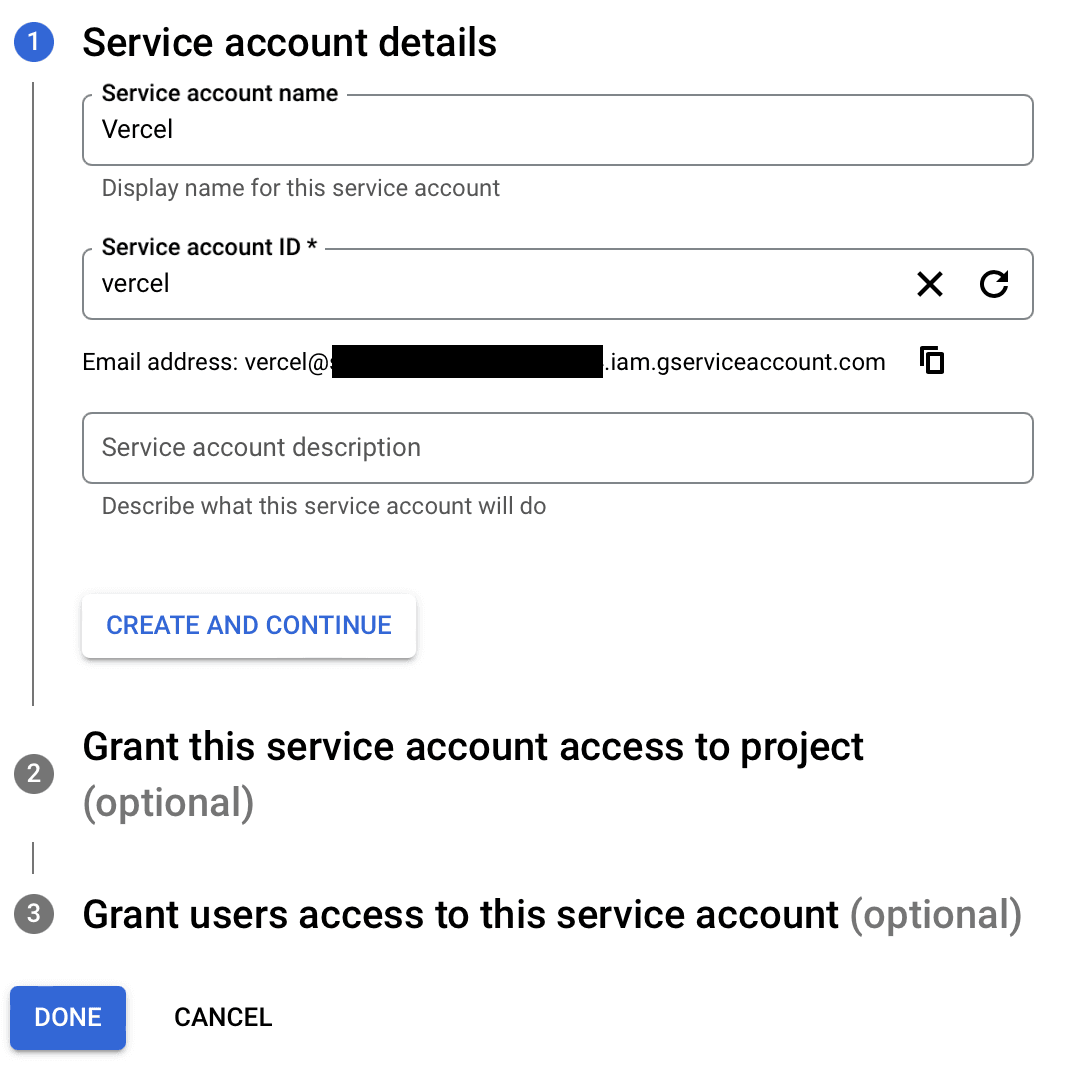 2. Enter an ID for the service account, e.g. and click Create and continue.