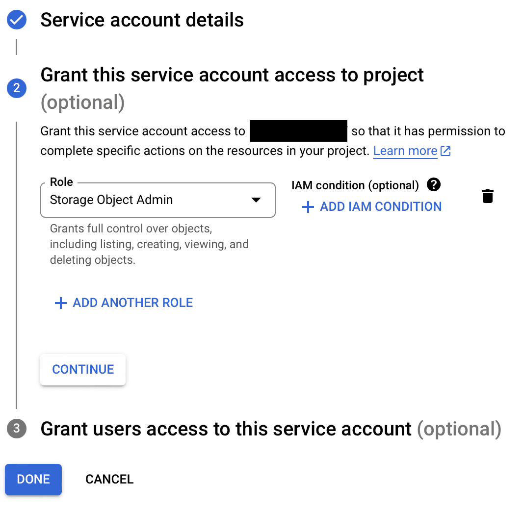 1. Select a role or roles for the service account, e.g. .