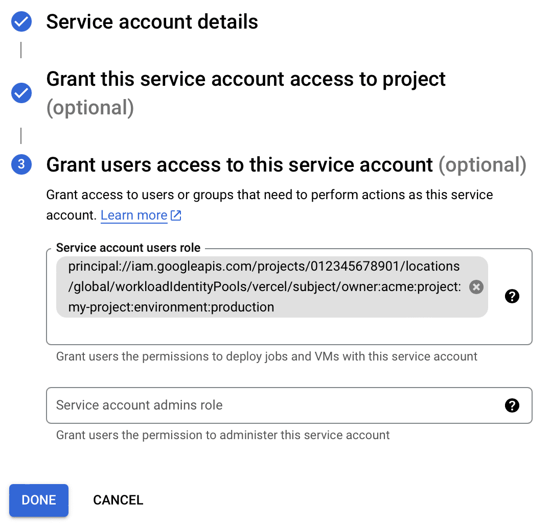• You can add multiple principals to this field, add a principal for each project and environment you want to grant access to.
