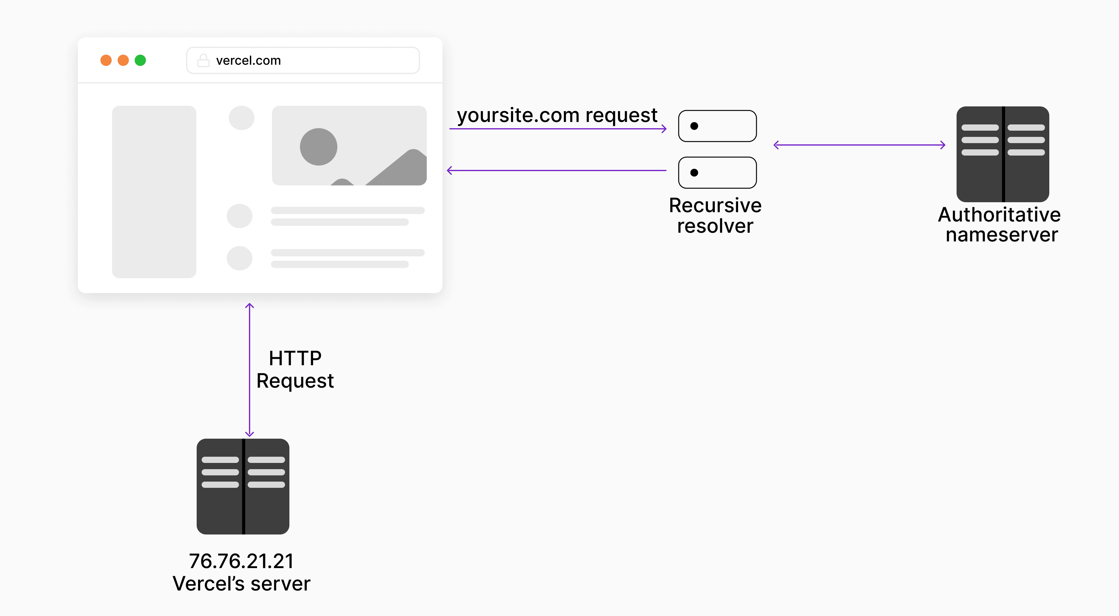 When you've created a Project and deployed it on Vercel, your site lives on Vercel's web servers, which we know to be at the IP address . However, your user's browser doesn't know that. For this reason, the browser will perform a DNS Lookup to retrieve the correct IP mapping to from a DNS server.
