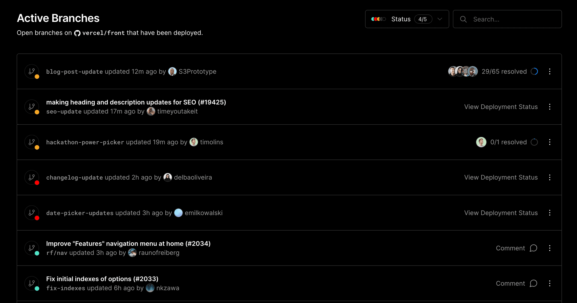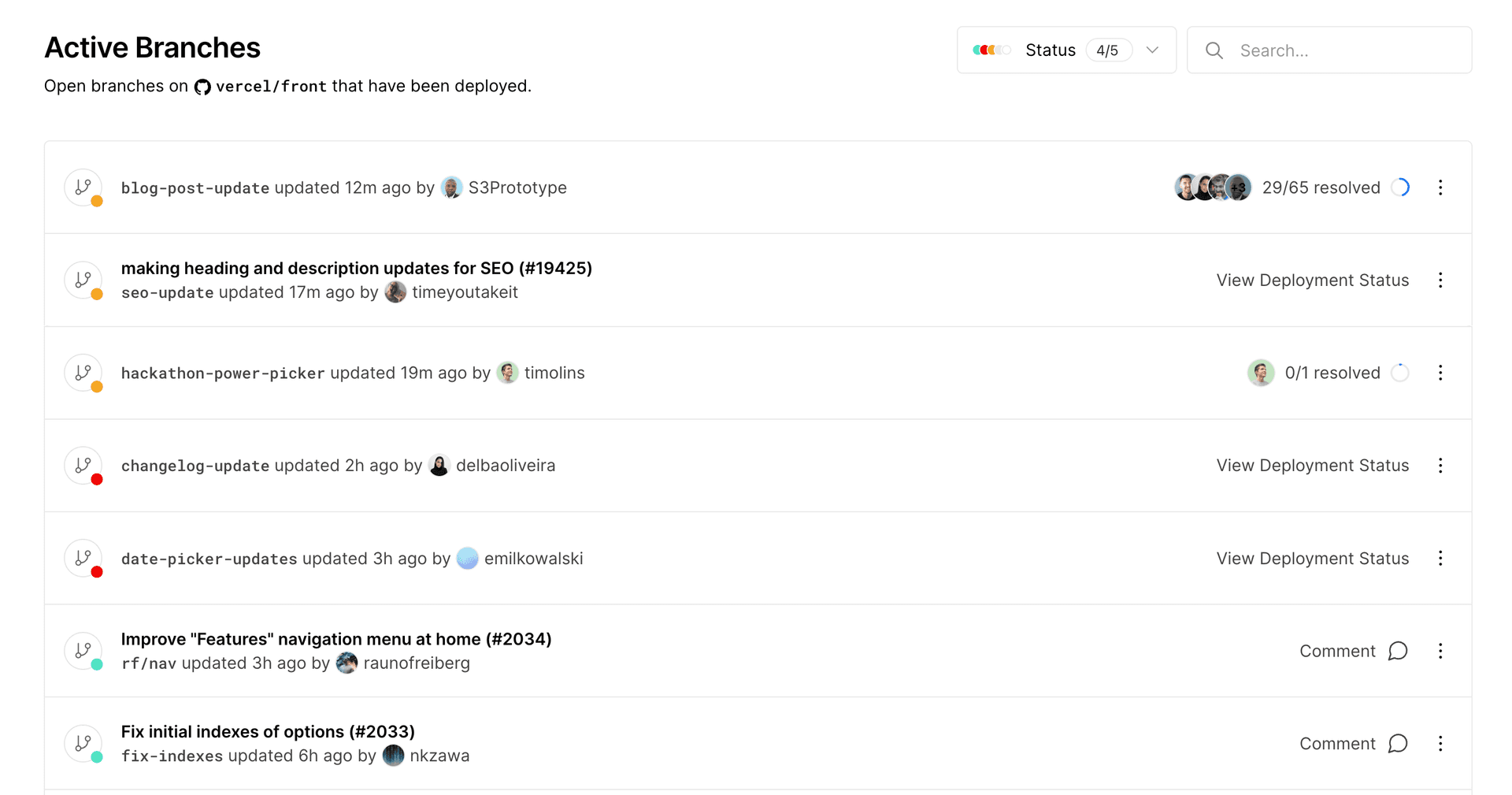 You can filter the list of active branches by a search term, and see the status of each branch's deployment at a glance with the colored circle icon to the left of the branch name.