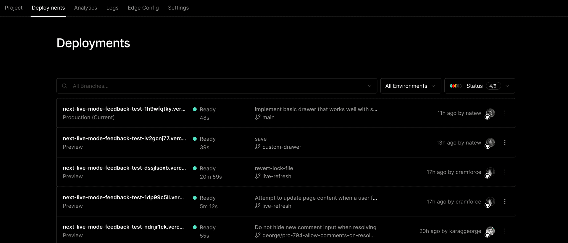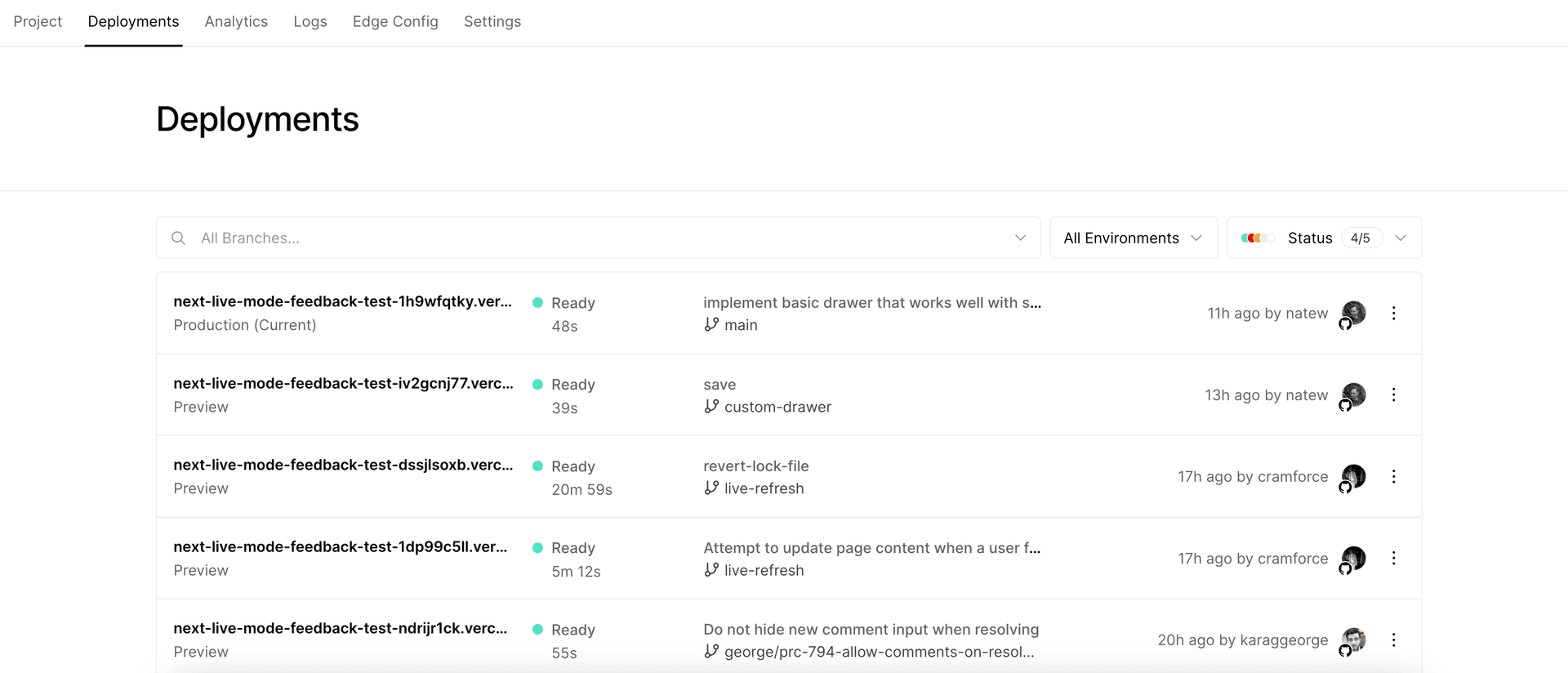 You can sort your deployments by branch, or by status. You can also interact with your deployment by redeploying it, inspecting it, assigning it a domain, and more.