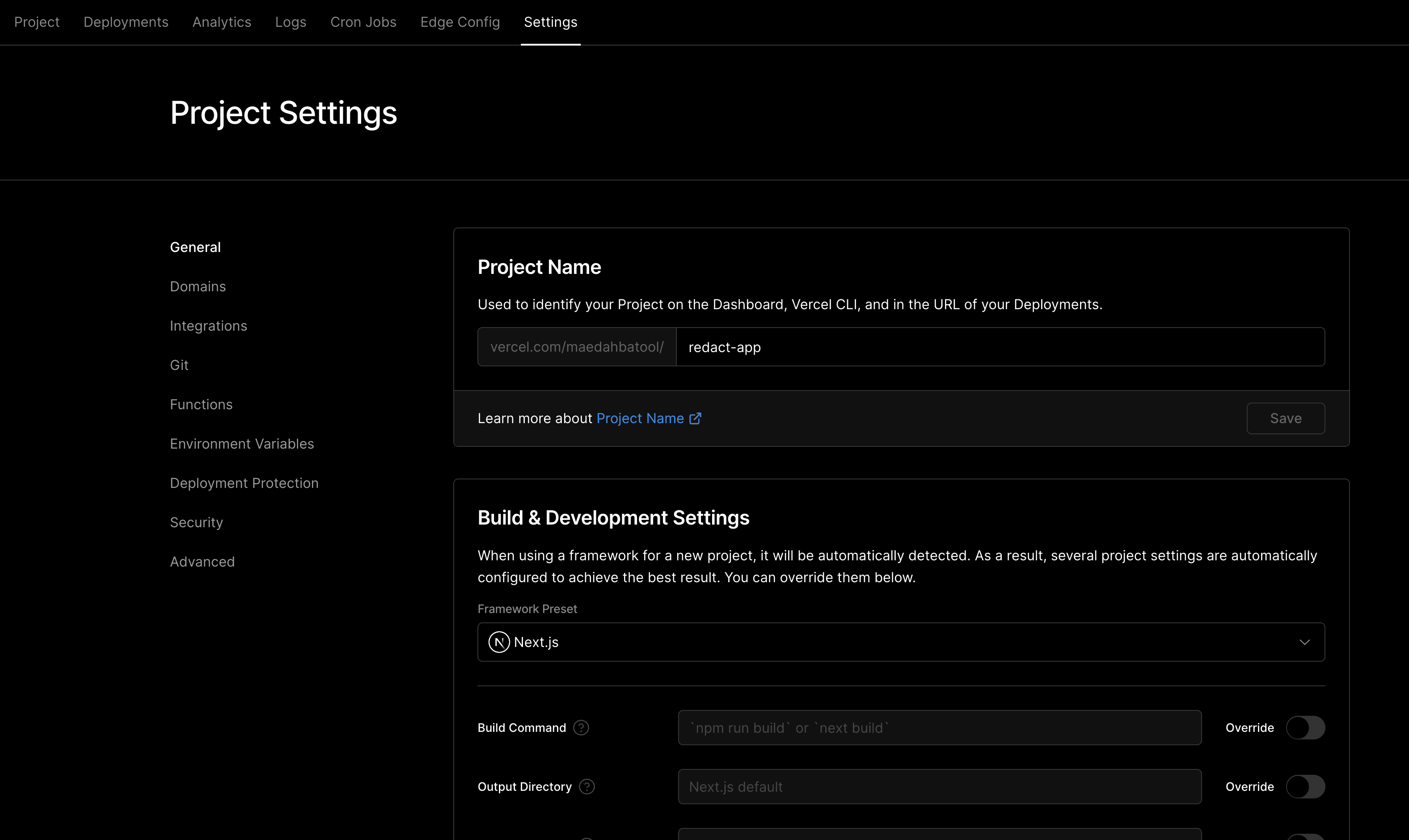 The Settings tab lets you configure your project. You can change the project's name, specify its root directory, configure environment variables and more directly in the dashboard.