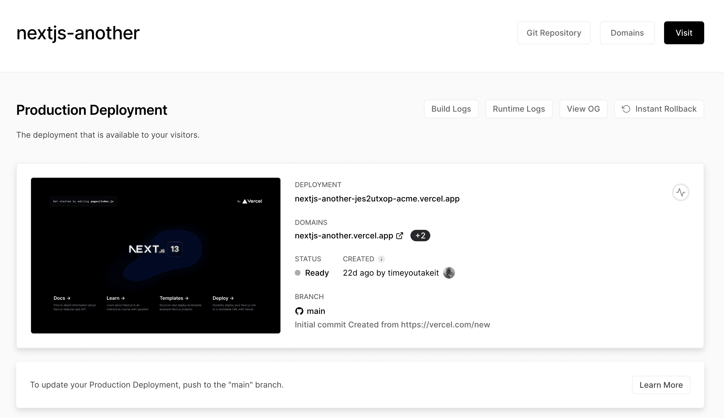 The Project Overview tab provides an overview of your production deployment, including its active Git branches, build logs, runtime logs, associated domains, and more.