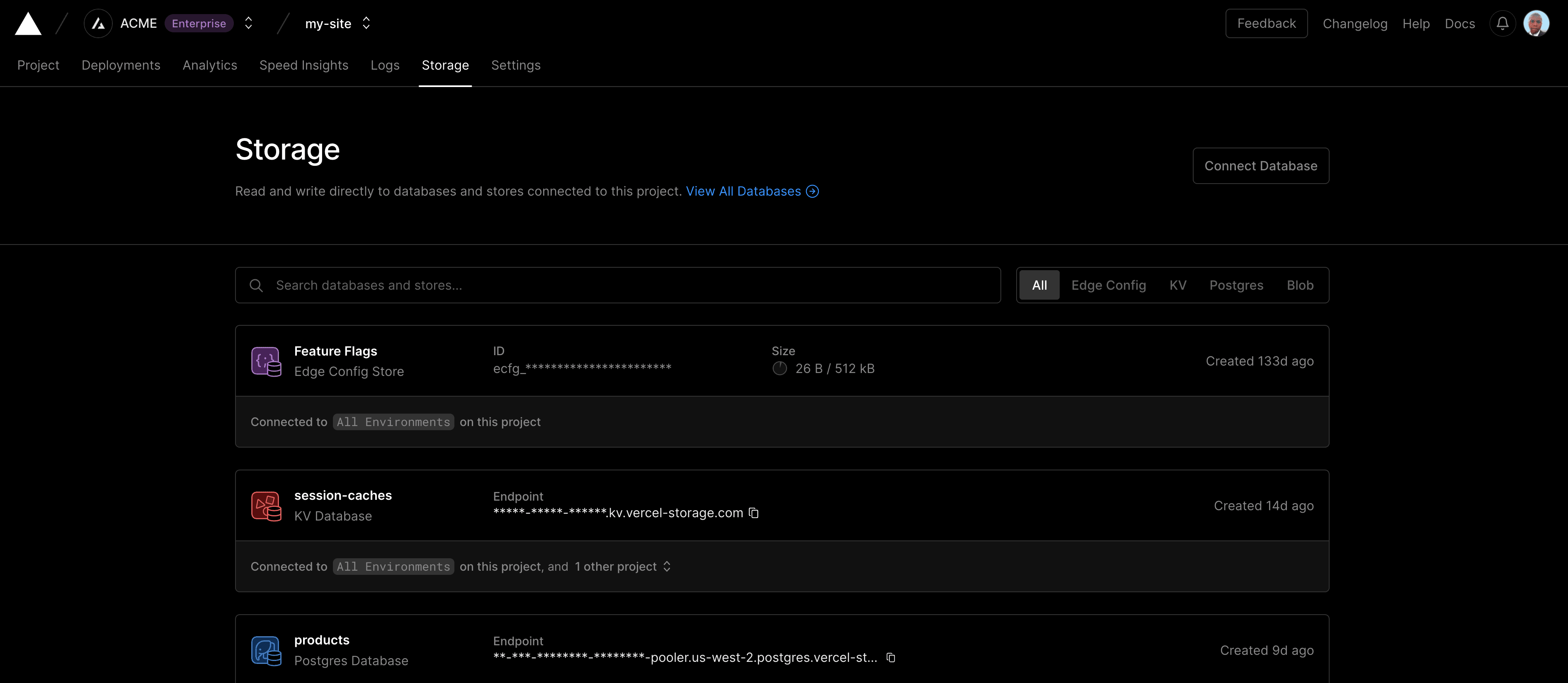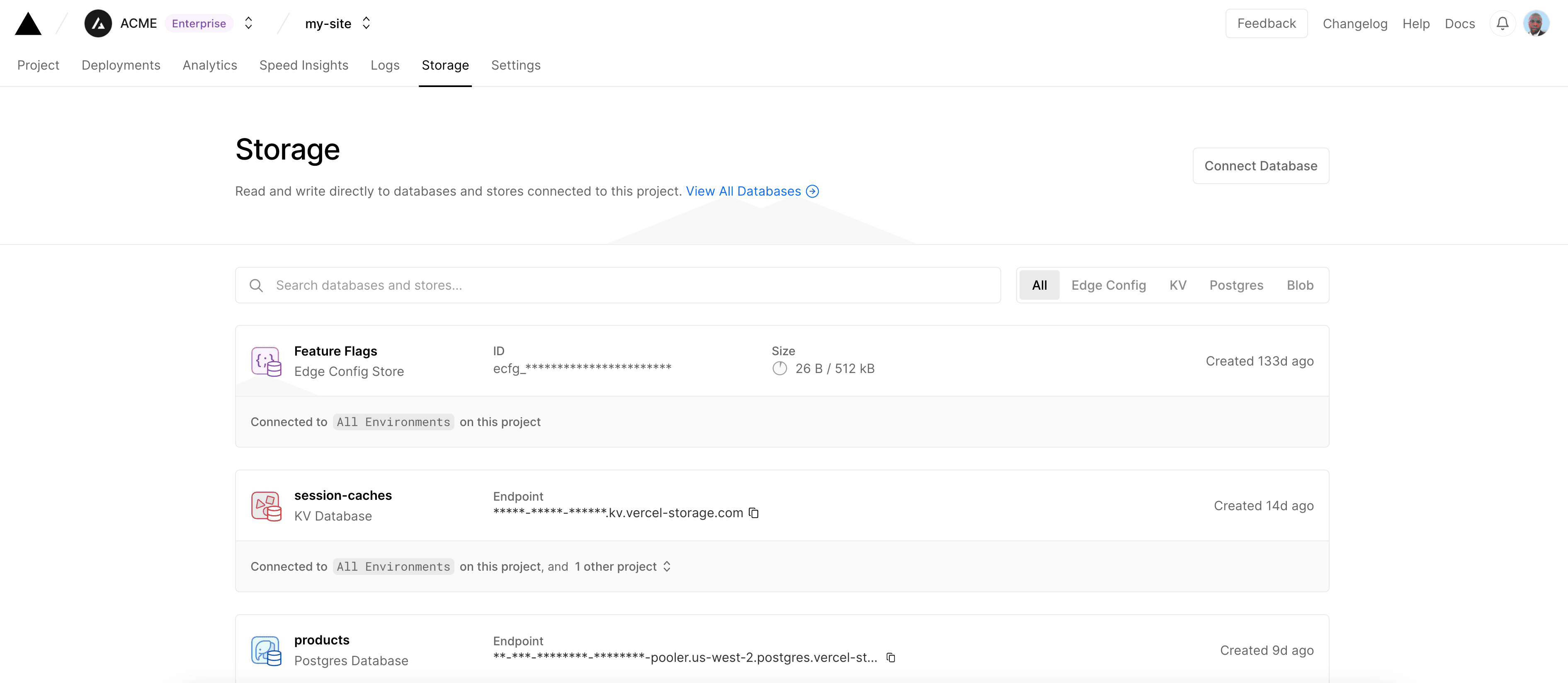The Storage tab lets you manage storage products connected to your project, including:
