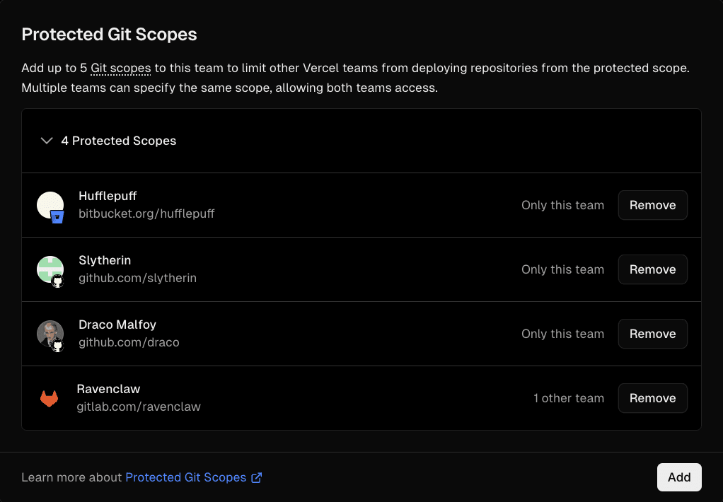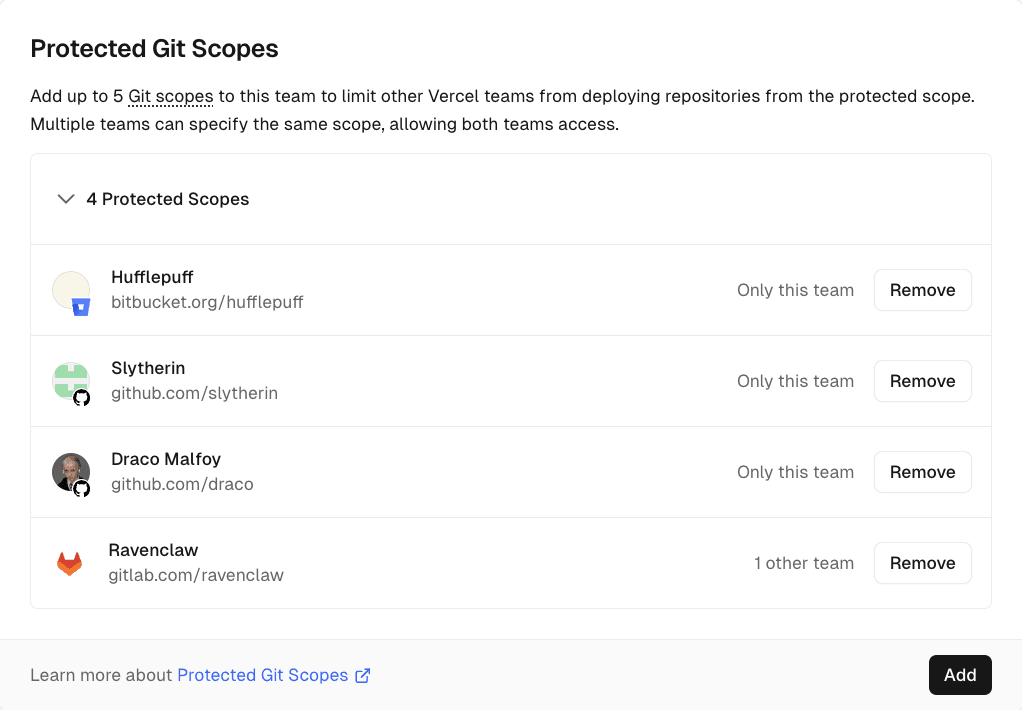 Only allow specific Vercel teams to deploy your Git repositories. As an owner of multiple teams you can claim the same scope for each Vercel team, allowing all of them to deploy repositories from your protected Git scope.