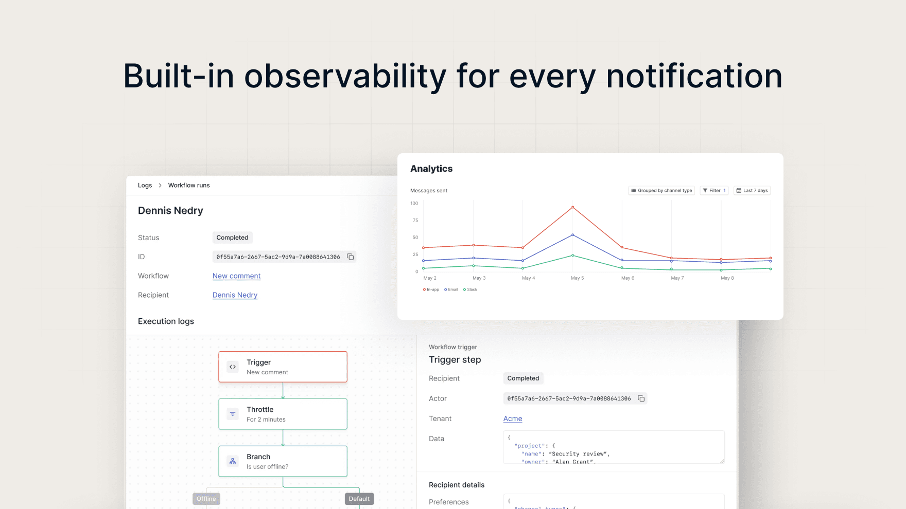 Built by developers, for developers. You get full observability and analytics about your message and user behavior, environments, git-like version control, and top-notch SDKs.